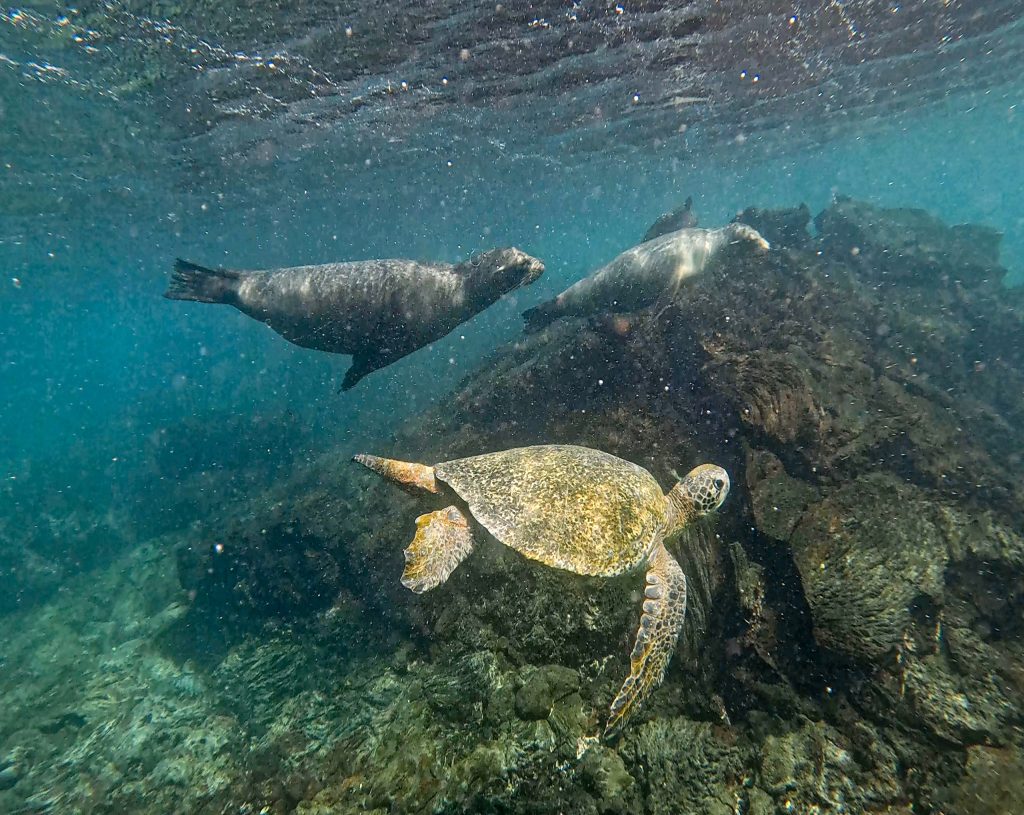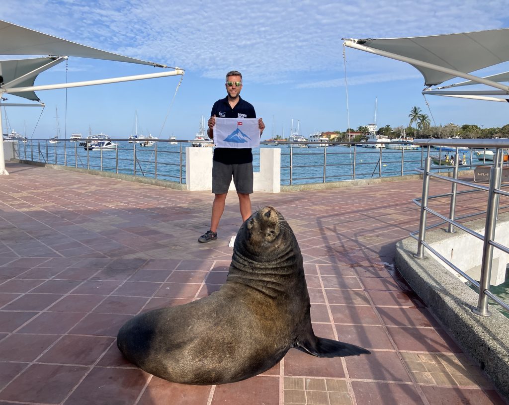 In May 2024, the flag journeyed back to Ecuador, this time Joe brought it to the Galapagos with the Darwin200 expedition. There the islands of San Cristobal, Santa Cruz and Bartolomé were visited. A series of live events for classrooms took place in the Galapagos and a lot of incredible wildlife was encountered, including giant tortoises, penguins, sea lions, green sea turtles, hammerhead sharks and marine iguanas to name a few!